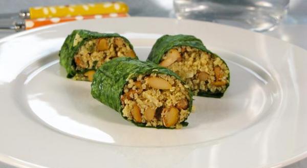 Feuilles d'épinards farcies aux champignons des bois et girolles