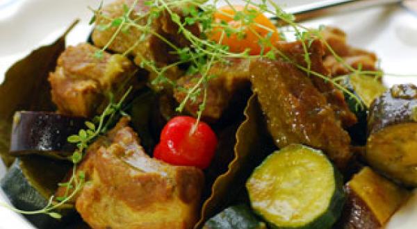 Ajouter les légumes et la poudre de colombo, rectifier l'assaisonnement, poser le piment sur l'ensemble et poursuivre la cuisson à feu doux et à couvert pendant 20 minutes.