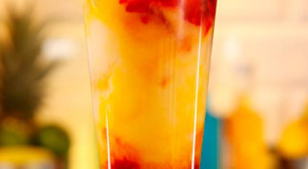 Ajouter doucement le jus de banane. Déposer deux cuillères à soupe de framboises sur le mélange.