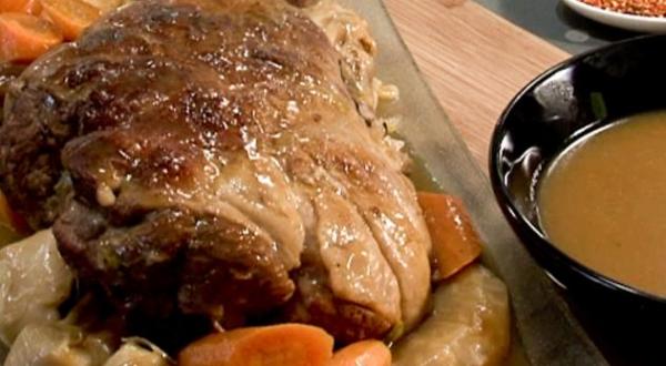 Sortir la cocotte du four, déposer le gigot sur une plaque de cuisson avec les légumes.