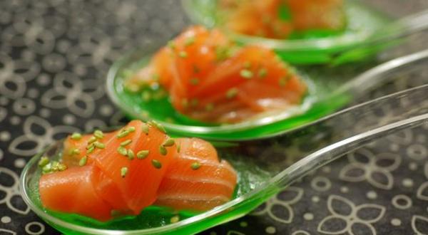 Découper le saumon en petites lamelles et les répartir sur les cuillères.