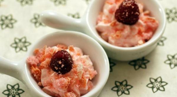 Saupoudrer avec le biscuit écrasé et pour finir décorer d'une framboise.