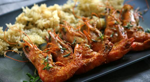 Gambas aux épices, moutarde et riz croquant