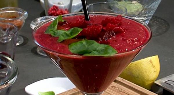 Remplir le verre avec le gaspacho, agrémenter à nouveau de framboises et de betterave.