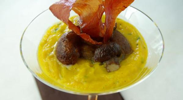 Poser les cèpes chauds à la surface. Décorer avec les lanières de jambon.