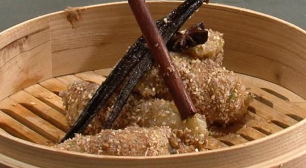 Bananes à la vapeur de saké, aux épices et à la noix de coco