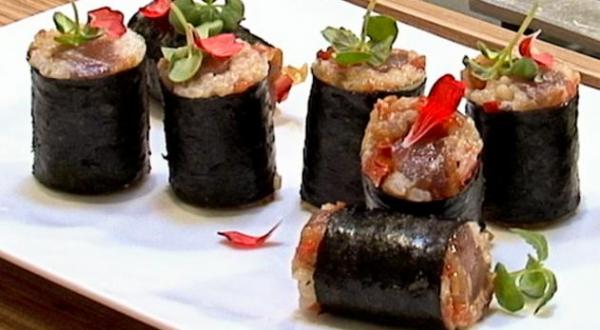 Déposer les lanières de thon sur le riz sur tout la largeur de la feuille. Refermer le maki en serrant légèrement et en tirant sur le tapis makisu.