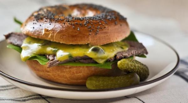 Déposer les feuilles de salade sur la base des bagels puis disposer des tranches de pastrami.