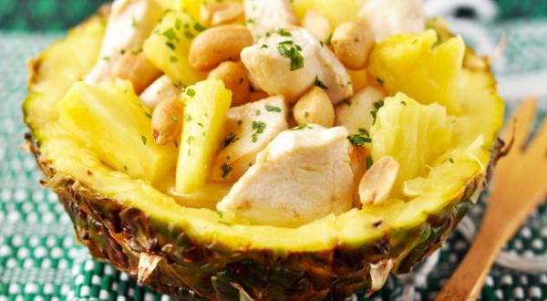 Evider les moitiés d'ananas et les réserver pour les utiliser comme contenant.