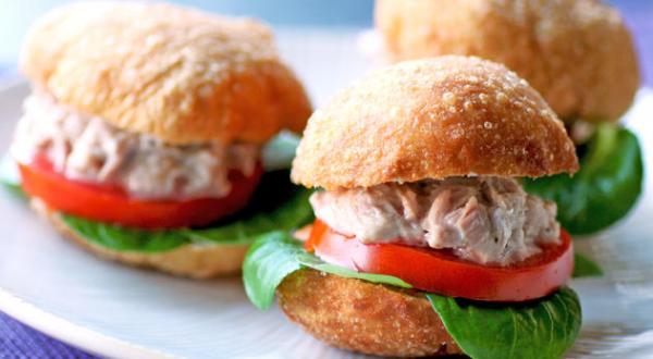 Couper les pains en deux à l'aide d'un couteau à dents. Garnir avec quelques feuilles de mâche, une rondelle de tomate et le thon.