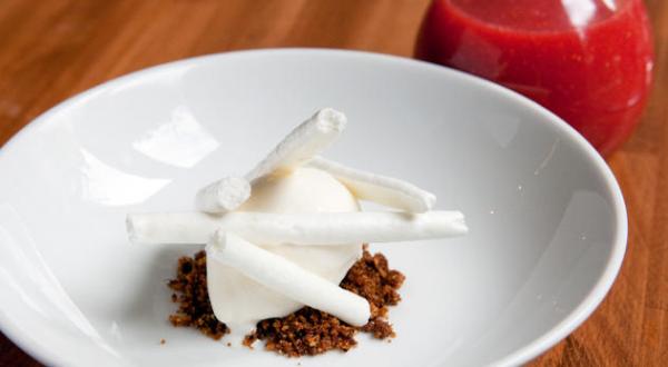 Crème glacée fromage blanc, mikado de meringue et gaspacho de fraises garigette