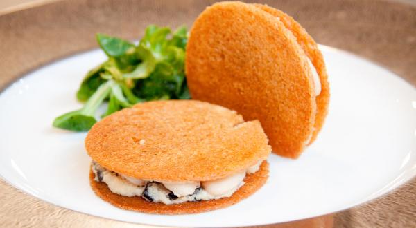 Disposer le sandwich vertical dans l'assiette puis déposer un autre sandwich à plat à côté. Servir aussitôt.