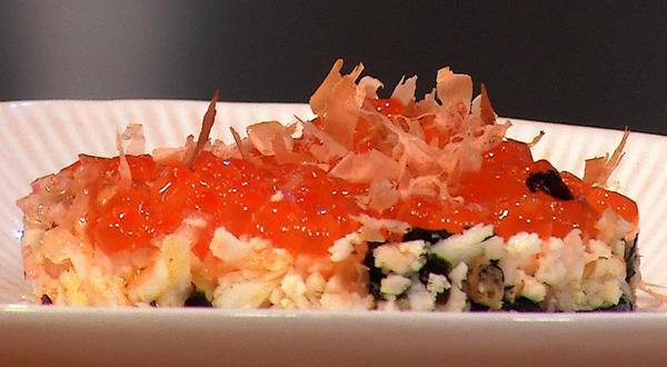 Ajouter des oeufs de saumon, de la bonite séchée et de la sauce vinaigrette sur la préparation.