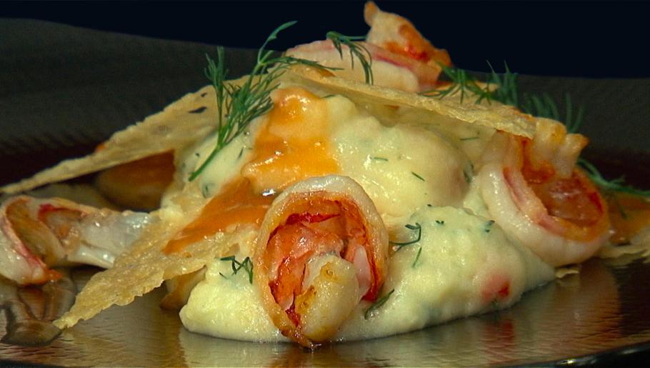 Disposer un peu de brandade de crevettes dans les assiettes de service.