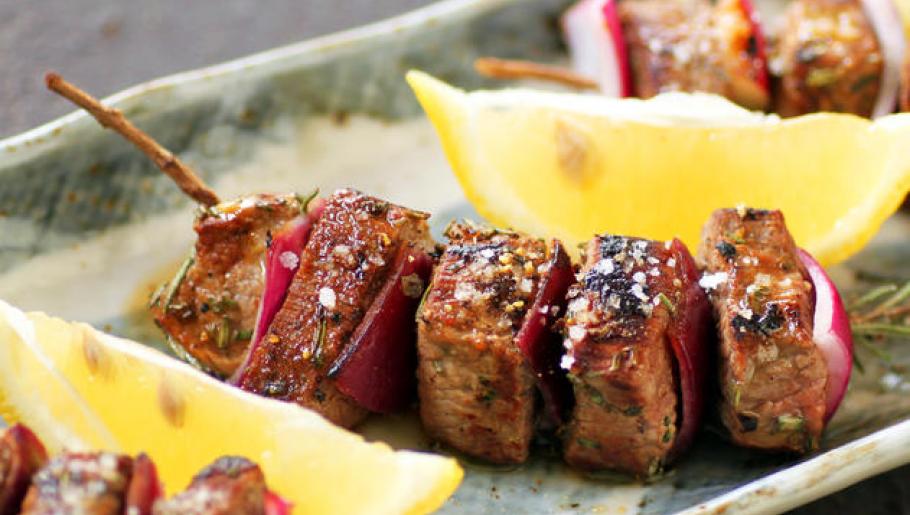 Transpercer chaque morceau de viande à l'aide d'un cure-dent puis les enfiler sur les branches de romarin en alternant avec l'oignon rouge.