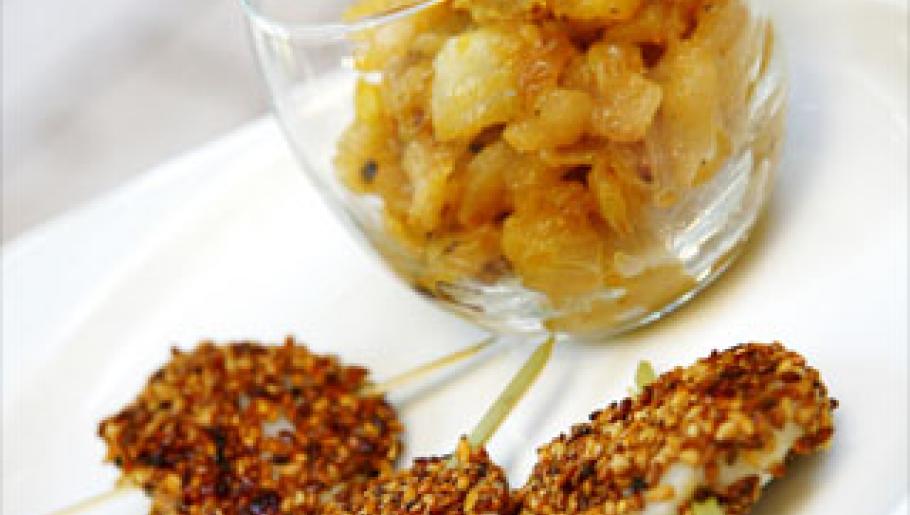 Brochettes de saint-jacques au sésame et compotée acidulée