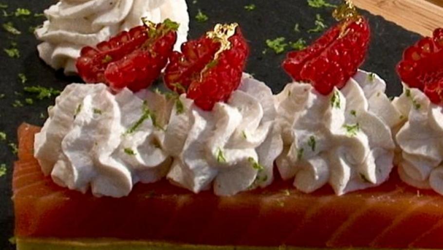 Coeur de saumon mariné sur moelleux de maïs, crème parfum framboise