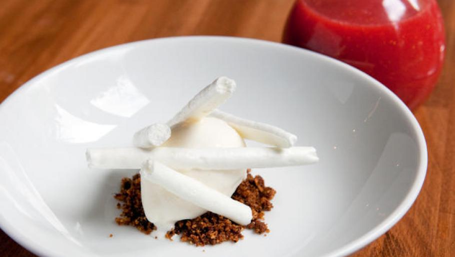 Crème glacée fromage blanc, mikado de meringue et gaspacho de fraises garigette