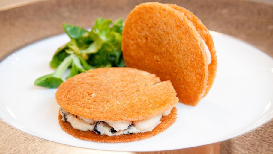 Disposer le sandwich vertical dans l'assiette puis déposer un autre sandwich à plat à côté. Servir aussitôt.