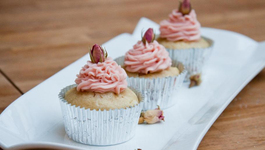 Décorer chaque cupcake avec un bouton de rose et déguster.