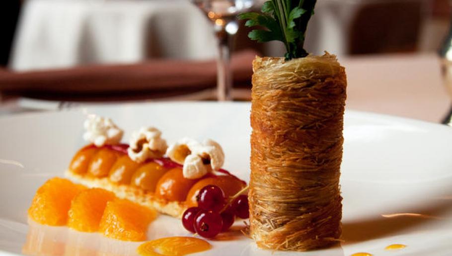 Escalope de foie gras en kadaïf, suprêmes d'oranges et tartelette de kumquat confit