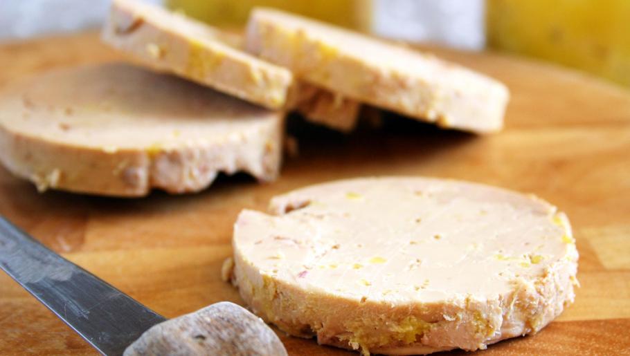 Sortir le foie gras du bocal et le trancher à l'aide d'un couteau de chef préalablement réchauffé dans un bol d'eau chaude.