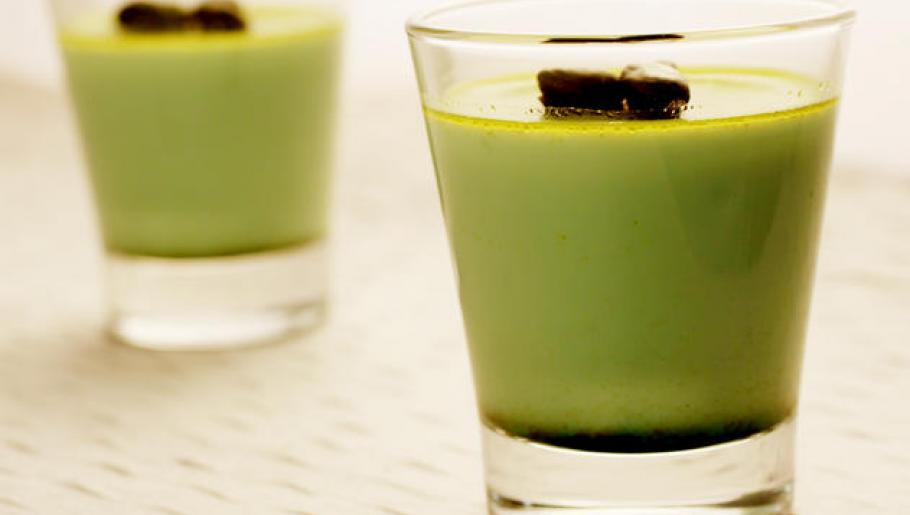 Répartir le mélange dans les verrines et laisser reposer à température ambiante pendant trente minutes puis au moins trois heures au réfrigérateur.