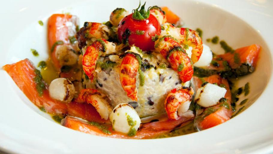 Décorer le riz avec les écrevisses et ajouter une tomate cerise au centre du dôme.