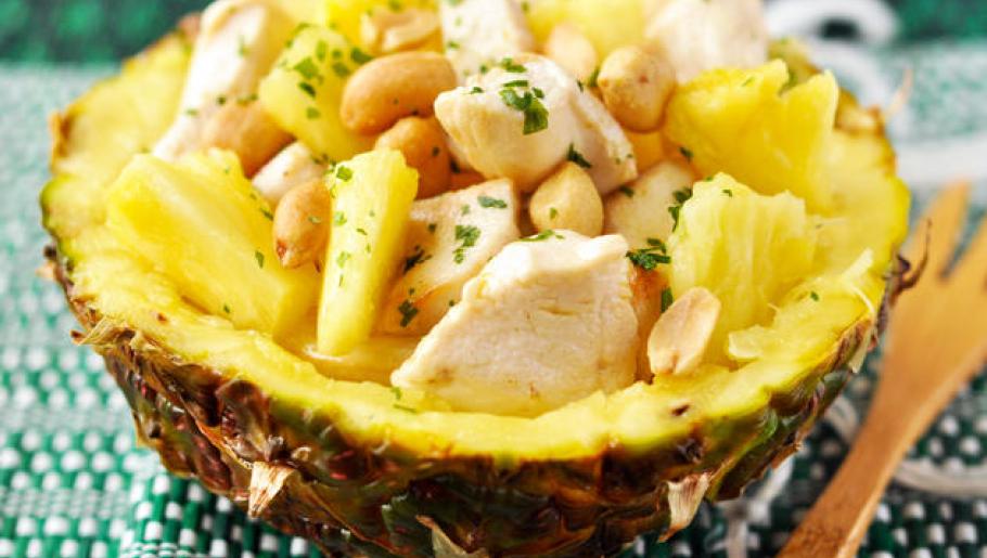 Evider les moitiés d'ananas et les réserver pour les utiliser comme contenant.