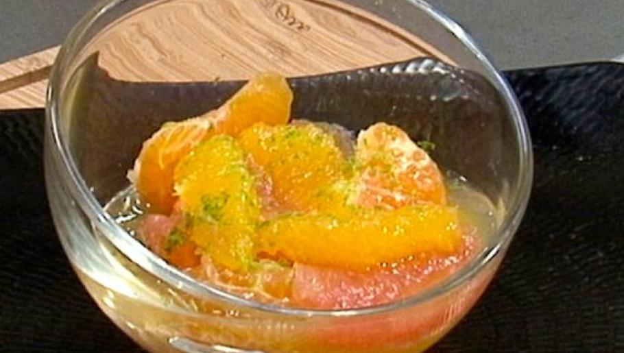 Dans un bol de dressage, verser les quartiers d'agrumes et du jus. Terminer en râpant quelques zestes de citron vert au dessus du bol avant de servir.
