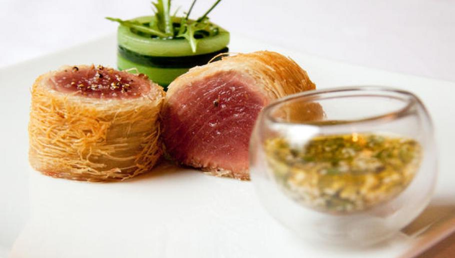 Thon rouge croustillant poivre et sel, condiment de sésame et coriandre fraîche au miel d'acacia par Frédéric Robert