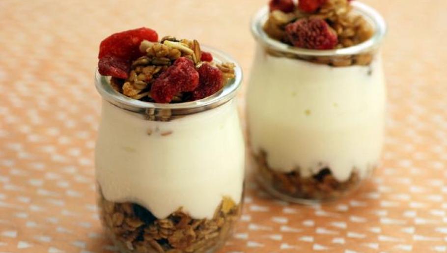 Répartir les deux tiers du muesli dans les pots, puis verser le yaourt dans les pots et mettre dans la yaourtière pendant 8 à 10 heures.